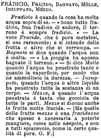 | Fradicio, Fracido, Bagnato, Molle, Inzuppato, Mezzo - Fradicio è quando la cosa ha molta acqua sopra di sè. - «Sono tutto fradicio, Son fradicio di sudore, Il terreno è sempre fradicio.» - La voce Fracido, che è pura metatesi, si usa raramente; e si intende delle frutta o altro che si corrompa. - Bagnato si dice quando l'acqua non è molta. - «La pioggia ha appena bagnato il terreno.» - Si dice Molle quando l'acqua ha penetrato tanto o quanto la superficie, per modo che ne ammollisce la durezza. - Inzuppato, quando l'acqua o altro liquido ha penetrato tutta la sostanza di un corpo. - Mezzo, è quando l'acqua penetrata è tanta che gocciola da tutte le parti. Mezze si dicono anche le frutte molto fracide. - [Ma quella delle frutte mezze è una fracidezza che spesso è necessaria a poterle mangiare, come nelle nespole, e non a tutti spiacevole, come in certe qualità di pere. G. F.] [immagine] |