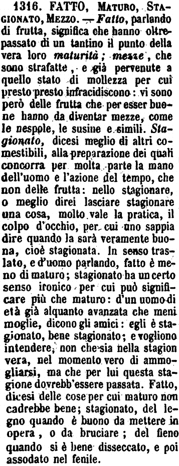 | Fatto, Maturo, Stagionato, Mezzo - Fatto, parlando di frutta, significa che hanno oltrepassato di un tantino il punto della loro vera maturità; mezze, che sono strafatte, e già pervenute a quello stato di mollezza per cui presto presto infracidiscono: vi sono però delle frutta che per essere buone hanno da diventar mezze, come le nespole, le susine e simili. Stagionato, dicesi meglio di altri comestibili, alla preparazione dei quali concorra per molta parte la mano dell'uomo e l'azione del tempo, che non delle frutta: nello stagionare, o meglio direi lasciare stagionare una cosa, molto vale la pratica, il colpo d'occhio, per cui uno sappia dire quando la sarà veramente buona, cioè stagionata. In senso traslato, e d'uomo parlando, fatto è meno di maturo; stagionato ha un certo senso ironico per cui può significare più che maturo: d'un uomo di età già alquanto avanzata che meni moglie, dicono gli amici: egli è stagionato, bene stagionato; e vogliono intendere, non che sia nella stagion vera, nel momento vero di ammogliarsi, ma che per lui questa stagione dovrebb'essere passata. Fatto, dicesi delle cose per cui maturo non cadrebbe bene; stagionato, del legno quando è buono da mettere in opera, o da bruciare; del fieno quando si è bene disseccato, e poi assodato nel fenile. [immagine] |
