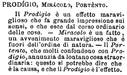 | Prodigio, Miracolo, Portento - Il Prodigio è un effetto maraviglioso che fa grande impressione sui sensi, e che esce dal corso ordinario delle cose. - Miracolo è un fatto, un avvenimento maraviglioso che è fuori dell'ordine di natura. - Il Portento, che molti confondono con Prodigio, annunzia da lontano cosa straordinaria: questo si potrebbe dire che è la causa, e che il Prodigio è l'effetto. [immagine] |