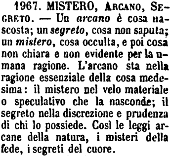 | Mistero, Arcano, Segreto - Un arcano è cosa nascosta; un segreto, cosa non saputa; un mistero, cosa occulta, e poi cosa non chiara e non evidente per la umana ragione. L'arcano sta nella ragione essenziale della cosa medesima: il mistero nel velo materiale o speculativo che la nasconde; il segreto nella discrezione e prudenza di chi lo possiede. Così le leggi arcane della natura, i misteri della fede, i segreti del cuore. [immagine] |