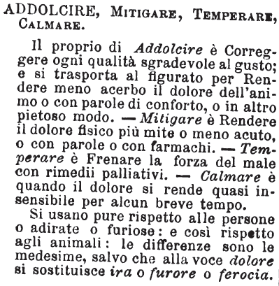 | Addolcire, Mitigare, Temperare, Calmare - Il proprio di Addolcire è Correggere ogni qualità sgradevole al gusto; e si trasporta al figurato per Rendere meno acerbo il dolore dell'animo o con parole di conforto, o in altro pietoso modo. - Mitigare è Rendere il dolore fisico più mite o meno acuto, o con parole o con farmachi. - Temperare è Frenare la forza del male con rimedii palliativi. - Calmare è quando il dolore si rende quasi insensibile per alcun breve tempo.