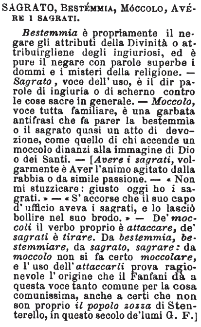 | Sagrato, Bestemmia, Moccolo, Avere i sagrati - Bestemmia è propriamente il negare gli attributi della Divinità o attribuirgliene degli ingiuriosi, ed è pure il negare con parole superbe i dommi e i misteri della religione. - Sagrato, voce dell'uso, è il dir parole di ingiuria o di scherno contro le cose sacre in generale. - Moccolo, voce tutta familiare, è una garbata antifrasi che fa parer la bestemmia o il sagrato quasi un atto di devozione, come quello di chi accende un moccolo dinanzi alla immagine di Dio o dei santi. - [Avere i sagrati, volgarmente è Aver l'animo agitato dalla rabbia o da simile passione. - «Non mi stuzzicare: giusto oggi ho i sagrati.» - «S'accorse che il suo capo d'ufficio aveva i sagrati, e lo lasciò bollire nel suo brodo.» - De' moccoli il verbo proprio è attaccare, de' sagrati è tirare. Da bestemmia, bestemmiare, da sagrato, sagrare: da moccolo non si fa certo moccolare, e l'uso dell'attaccarli prova ragionevole l'origine che il Fanfani dà a questa voce tanto comune per la cosa comunissima, anche a certi che non son proprio il popolo zozza di Stenterello, in questo secolo de' lumi G. F.] [immagine] |