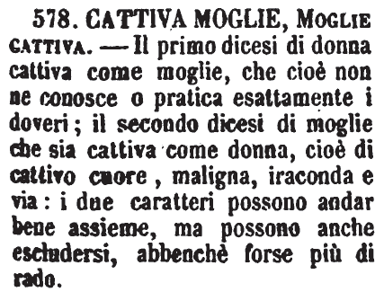| Cattiva moglie, Moglie cattiva - Il primo dicesi di donna cattiva come moglie, che cioè non ne conosce o pratica esattamente i doveri; il secondo dicesi di moglie che sia cattiva come donna, cioè di cattivo cuore, maligna, iraconda e via: i due caratteri possono andar bene assieme, ma possono anche escludersi, abbenchè forse più di rado. [immagine] |