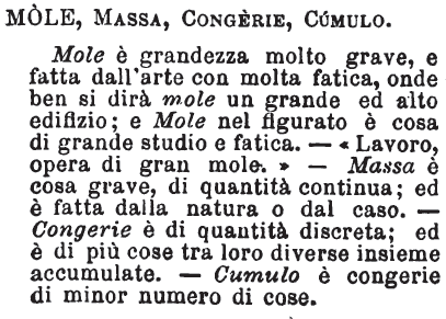 | Mole, Massa, Congerie, Cumulo - Mole è grandezza molto grave, e fatta dall'arte con molta fatica, onde ben si dirà mole un grande ed alto edifizio; e Mole nel figurato è cosa di grande studio e fatica. - « Lavoro, opera di gran mole. » - Massa è cosa grave, di quantità continua; ed è fatta dalla natura o dal caso. - Congerie è di quantità discreta; ed è di più cose tra loro diverse insieme accumulate. - Cumulo è congerie di minor numero di cose. [immagine] |