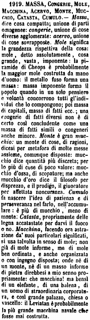 | Massa, Congerie, Mole, Macchina, Acervo, Monte, Mucchio, Catasta, Cumulo - Massa, dice cosa compatta; unione di parti omogenee: congerie, unione di cose diverse agglomerate: acervo, unione di cose sovrapposte. Mole significa la grandezza rispettiva della cosa: mole, detto assolutamente, cosa grande, vasta, imponente: la piramide di Cheops è probabilmente la maggior mole costrutta da mano d'uomo: il metallo fuso forma una massa: massa imponente forma il popolo quando in un solo pensiero e volontà concorrono tutti gl'individui che lo compongono; poi massa di capitali, massa di fatti ecc.; una congerie di fatti diversi non è di certo così concludente come una massa di fatti simili o congeneri anche minore. Monte è gran mucchio: un monte di cose, di ragioni, dicesi per metafora di molte messe assieme, comunque disposte: mucchio dice quantità più discreta; per lo più di cose di poco valore: mucchio d'ossa, di scopature; ma anche mucchio d'oro dice il filosofo per disprezzo, e il prodigo, il giuocatore per affettata noncuranza. Cumulo fa nascere l'idea di pazienza e di perseveranza nel farlo, nell'accumulare: è più di mucchio, meno di monte: Catasta, propriamente delle legna accatastate per darvi il fuoco o no. Macchina, facendo ora astrazione da' suoi particolari significati, si usa talvolta in senso di mole; non già di mole informe, ma di mole ben ordinata, e anche organizzata o con ingegno disposta; onde nè di un monte, nè di un masso informe di pietra direbbesi a mio senno propriamente: che macchina! ma bensì di un elefante, di una balena, di un uomo di straordinaria corporatura, e così grande palazzo, chiesa o vascello: il Leviatan è probabilmente la più grande macchina navale che fosse mai costrutta. [immagine] |