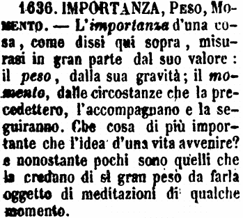 | Importanza, Peso, Momento - L'importanza d'una cosa, come dissi qui sopra, misurasi in gran parte dal suo valore: il peso, dalla sua gravità; il momento, dalle circostanze che la precedettero, l'accompagnano e la seguiranno. Che cosa di più importante che l'idea d'una vita avvenire? e nonostante pochi sono quelli che la credano di sì gran peso da farla oggetto di meditazioni di qualche momento. [immagine] |