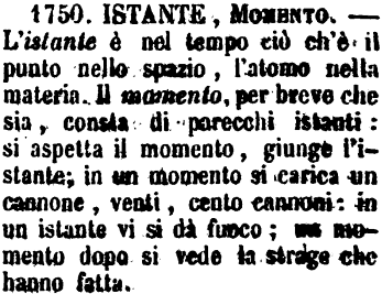 | Istante, Momento - L'istante è nel tempo ciò ch'è il punto nello spazio, l'atomo nella materia. Il momento, per breve che sia, consta di parecchi istanti: si aspetta il momento, giunge l'istante; in un momento si carica un cannone, venti, cento cannoni: in un istante vi si dà fuoco; un momento dopo si vede la strage che hanno fatta. [immagine] |