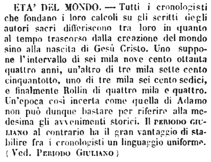 | Età del mondo - Tutti i cronologisti che fondano i loro calcoli su gli scritti degli autori sacri differiscono tra loro in quanto al tempo trascorso dalla creazione del mondo sino alla nascita di Gesù Cristo. Uno suppone l'intervallo di sei mila nove cento ottanta quattro anni, un'altro di tre mila sette cento cinquantotto, uno di tre mila sei cento sedici, e finalmente Rollin di quattro mila e quattro. Un'epoca così incerta come quella di Adamo non può dunque bastare per riferire alla medesima gli avvenimenti storici. Il periodo giuliano al contrario ha il gran vantaggio di stabilire fra i cronologisti un linguaggio uniforme. (Ved. Periodo Giuliano) [immagine] |