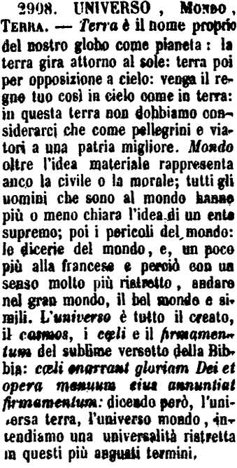 | Universo, Mondo, Terra - Terra è il nome proprio del nostro globo come pianeta: la terra gira attorno al sole: terra poi per opposizione a cielo: venga il regno tuo così in cielo come in terra: in questa terra non dobbiamo considerarci che come pellegrini e viatori a una patria migliore. Mondo oltre l'idea materiale rappresenta anco la civile o la morale; tutti gli uomini che sono al mondo hanno più o meno chiara l'idea di un ente supremo; poi i pericoli del mondo: le dicerie del mondo, e, un poco più alla francese e perciò con un senso molto più ristretto, andare nel gran mondo, il bel mondo e simili. L'universo è tutto il creato, il cosmos, i cœli e il firmamentum del sublime versetto della Bibbia: cœli enarrant gloriam Dei et opera manuum eius annuntiat firmamentum: dicendo però, l'universa terra, l'universo mondo, intendiamo una universalità ristretta in questi più angusti termini. [immagine] |