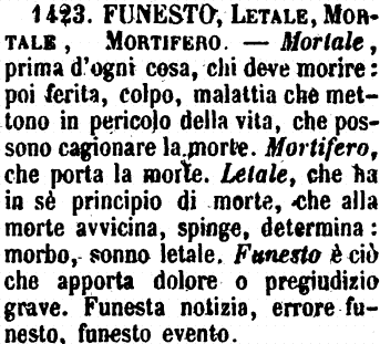 | Funesto, Letale, Mortale, Mortifero - Mortale, prima d'ogni cosa, chi deve morire: poi ferita, colpo, malattia che mettono in pericolo della vita, che possono cagionare la morte. Mortifero, che porta la morte. Letale, che ha in sè principio di morte, che alla morte avvicina, spinge, determina: morbo, sonno letale. Funesto è ciò che apporta dolore o pregiudizio grave. Funesta notizia, errore funesto, funesto evento. [immagine] |