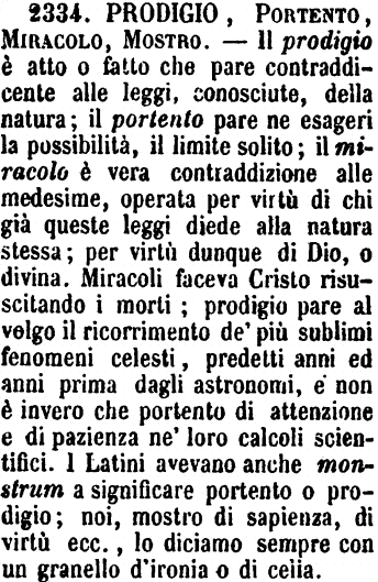 | Prodigio, Portento, Miracolo, Mostro - Il prodigio è atto o fatto che pare contraddicente alle leggi, conosciute, della natura; il portento pare ne esageri la possibilità, il limite solito; il miracolo è vera contraddizione alle medesime, operata per virtù di chi già queste leggi diede alla natura stessa; per virtù dunque di Dio, o divina. Miracoli faceva Cristo risuscitando i morti; prodigio pare al volgo il ricorrimento de' più sublimi fenomeni celesti, predetti anni ed anni prima dagli astronomi, e non è invero che portento di attenzione e di pazienza ne' loro calcoli scientifici. I Latini avevano anche monstrum a significare portento o prodigio; noi, mostro di sapienza, di virtù ecc., lo diciamo sempre con un granello d'ironia o di celia. [immagine] |