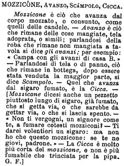 | Mozzicone, Avanzo, Scampolo, Cicca - Mozzicone è ciò che avanza dal corpo mozzato, o consunto, come quelli delle candele. - Avanzo è ciò che rimane delle cose mangiate, tela adoprata, o simili; parlandosi della roba che rimane non mangiata a tavola si dice gli avanzi; per esempio: «Campa con gli avanzi di casa B.» - Parlandosi di tela o di panno, ciò che rimane in bottega, dopo essere stata venduta la maggior parte, si dice Scampolo. - Quel che avanza dal sigaro fumato, è la Cicca. - [Mozzicone dicesi anche un pezzetto piuttosto lungo di sigaro, già fumato, che si getta via, o che sarebbe da gettar via, o che si lascia spento. - «Non ti vergogni, un signore come te, a fumare cotesti mozziconi? - Ti darei volentieri un sigaro: ma non ho che questo mozzicone: se te ne giovi, padrone.» - La Cicca è molto più corta del mozzicone, e non è più fumabile che trinciata per la pipa. G. F.] [immagine] |