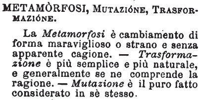 | Metamorfosi, Mutazione, Trasformazione - La Metamorfosi è cambiamento di forma maraviglioso o strano e senza apparente cagione.- Trasformazione è più semplice e più naturale, e generalmente se ne comprende la ragione.- Mutazione è il puro fatto considerato in sè stesso. [immagine] |