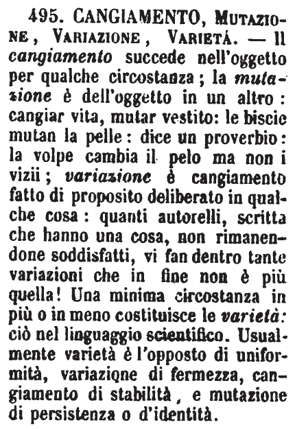 | Cangiamento, Mutazione, Variazione, Varietà - Il cangiamento succede nell'oggetto per qualche circostanza; la mutazione è dell'oggetto in un altro: cangiar vita, mutar vestito: le biscie mutan la pelle: dice un proverbio: la volpe cambia il pelo ma non i vizii; variazione è cangiamento fatto di proposito deliberato in qualche cosa: quanti autorelli, scritta che hanno una cosa, non rimanendone soddisfatti, vi fan dentro tante variazioni che in fine non è più quella! Una minima circostanza in più o in meno costituisce le varietà: ciò nel linguaggio scientifico. Usualmente varietà è l'opposto di uniformità, variazione di fermezza, cangiamento di stabilità, e mutazione di persistenza o d'identità. [immagine] |