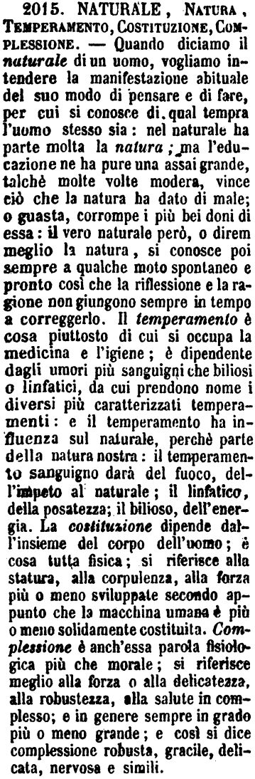 | Natura, Indole, Naturale, Temperamento, Complessione, Costituzione - Per Natura si intendono le qualità fisiche e morali dell'uomo considerate tutte insieme; e in genere le proprietà che ciascun corpo ha dalla natura. - Indole è la naturale disposizione dell'animo. - Il Temperamento indica la proporzione degli umori tra sé, e ha riferenza con delle qualità variabili che non sono essenziali alla vita. - La Costituzione si riferisce all'intero organismo, e comprende il temperamento e la complessione. [immagine] |