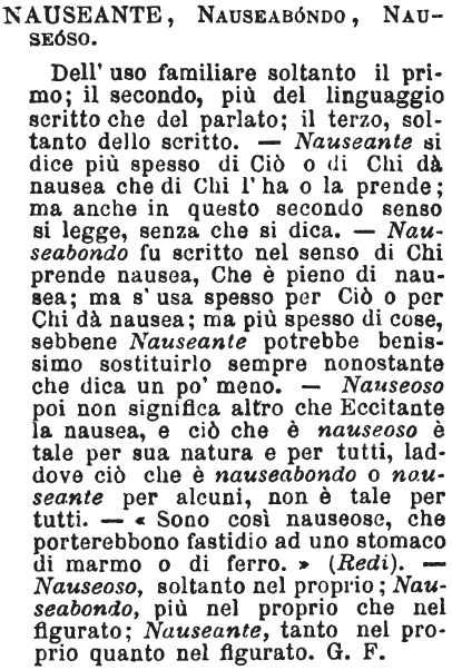| Nauseante, Nauseabondo, Nauseoso - Dell’uso familiare soltanto il primo; il secondo, più del linguaggio scritto che del parlato; il terzo, soltanto dello scritto. - Nauseante si dice più spesso di Ciò o di Chi dà nausea che di Chi l’ha o la prende; ma anche in questo secondo senso si legge, senza che si dica. - Nauseabondo fu scritto nel senso di Chi prende nausea, Che è pieno di nausea; ma s’usa spesso per Ciò o per Chi dà nausea; ma più spesso di cose, sebbene Nauseante potrebbe benissimo sostituirlo sempre nonostante che dica un po’ meno. - Nauseoso poi non significa altro che Eccitante la nausea, e ciò che è nauseoso è tale per sua natura e per tutti, laddove ciò che è nauseabondo o nauseante per alcuni, non è tale per tutti. - «Sono così nauseose, che porterebbero fastidio ad uno stomaco di marmo o di ferro.» (Redi). - Nauseoso, soltanto nel proprio; Nauseabondo, più nel proprio che nel figurato; Nauseante, tanto nel proprio quanto nel figurato. G. F. [immagine] |