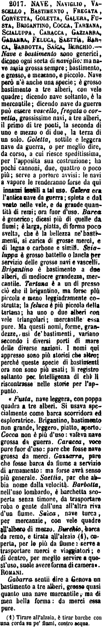 | Nave, Naviglio, Vascello, Bastimento, Fregata, Corvetta, Goletta, Galera, Fusta, Brigantino, Cocca, Tartana, Scialuppa, Caracca, Gazzarra, Gabarra, Feluca, Saettìa, Barca, Barbotta, Saìca, Burchio - Nave e bastimento sono generici, dicono ogni sorta di naviglio: ma nave assai grossa sempre; bastimento, e grosso, e mezzano, e piccolo. Nave però n'è anche una specie; è grosso bastimento a tre alberi, con vele quadre; dicendo nave soltanto, è la mercantile; dicendo nave da guerra può essere vascello, fregata o corvetta, grossissime navi, a tre alberi, il primo di tre ponti, la seconda di uno e mezzo o di due, la terza di un solo. Goletta, sottile e leggera nave da guerra, o per meglio dire, da corso, a cui riesce speditissima, per l'apposita sua costruzione; ha pochi cannoni, due, quattro o poco più; serve a portare avvisi: le navi a vapore le renderanno forse da qui innanzi inutili a tal uso. Galera era l'antica nave da guerra; spinta e dal vento nelle vele, e da grande quantità di remi; ora fuor d'uso. Barca è generico; dicesi più di quelle da fiumi; è larga, piatta, di forma poco svelta, che è la bellezza ne' bastimenti, si carica di grosse merci, e di legna o carbone e simili. Scialuppa è grosso battello o lancia per servizio delle grosse navi e vascelli. Brigantino è bastimento a due alberi, di mediocre grandezza, mercantile. Tartana è a un di presso ciò che il brigantino, ma forse più piccola e meno leggiadramente costrutta; la feluca è più piccola della tartana; ha uno o due alberi con vele triangolari; mercantile essa pure. Ma questi nomi, forme, grandezze, usi de' bastimenti, variano secondo i diversi porti di mare delle diverse nazioni. I nomi qui appresso sono più storici che altro; perchè queste specie di bastimenti ora non sono più usati; li registro soltanto per intelligenza di chi li riscontrasse nelle storie per l'appunto.