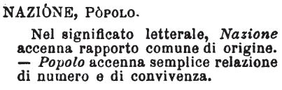 2. Per Generazione. Non com. Tes. Br. 1. 46. (C) Non temer niente, che la nazione del tuo figliuolo sarà vero lume, e giudicherà il popolo d'Israel. M. V. 1. 2. (C) Pensando l'utilità salutevole, che di questa memoria puote avvenire alle nazioni che dopo noi seguiranno. [Camp.] Bib. I. 17. Di lei ti darò figliuolo, il quale io benedicerò, e sarà in nazione (eritque in nationes) grande, e di lui nasceranno re… 3. [Fanf.] La università dei cittadini di un dato paese viventi in paese straniero. Gal. Gal. Lett. I. 38. Fu due volte in Soria, e dimorò in Aleppo medico della nazione (cioè de' Veneziani colà dimoranti). 4. † Per Origine, Stirpe, Schiatta. G. V. 1. 26. 1. (C) E poi, sappiendo loro reale nazione, congregarono ladroni, e fuggitivi, e sbanditi, e gente d'ogni condizione, disposti a mal fare. Bocc. Nov. 6. g. 7. S'innamorò d'un giovane… assai piacevole, e costumato, comechè di gran nazion non fosse. Cron. Morell. 316. Egli era un uomo di vile nazione. [Camp.] D. Conv. Canz. III. Nè voglion che vil uom gentil divegua, Nè di vil padre scenda Nazion, che per gentil giammai s'intenda. 5. † Vale anche Venuta al mondo, Nascita. Cron. Morell. 225. (C) Non si descrive la morte di Calandro, perchè non ne troviamo nulla certezza; ma per non lasciare così ignudo i fatti suoi a me pare… che si possa venire appresso a qualche chiarità della sua nazione, e appresso della morte. 6. Per Luogo natale, Provincia. Dant. Inf. 1. (M.) E sua nazion sarà tra Feltro e Feltro. [T.] Nazione, Schiatta d'uomini avente la medesima origine e parlante la lingua medesima. Unione di gente in vincolo di tradizioni civili, morali, intellettuali. Società di famiglie in vincolo comune e costante di discendenza, di tradizioni, d'affetti, di linguaggio, d'istituzione, di fatti, d'abitazione: massime di tradizioni e d'affetti. Quella è più propriam. Nazione, ove gli uomini hanno comune la schiatta, la lingua, le leggi, e la potenza e la volontà d'eseguirle. II. T. I sensi indeterminatamente promiscui che soglionsi dare a Gente, Popolo, Nazione, sono documento storico da meditarsi, e da farne un'analisi chimica per distinguerne al possibile gli elementi. Gente, col suono, dice Generazione; e ha però senso più gen., che s'applica tanto alle private famiglie, quanto alle grandi famiglie de' popoli. Genti anco le tribù barbare e le selvagge. Gente principio di Nazione. T. Crescere di gente in nazioni. Quindi può dirsi Gente d'ogni nazione, e Nazioni di più genti diverse. Decr. milan. Altri delle straniere genti e nazioni. T. Popolo, nella sua orig. porta l'idea di moltitudine, avente o no schiatta comune, più o meno civilm. ordinata. Dicevasi a tutto andare Storia de' popoli italiani; nè si sognavano di dire Storia della nazione italiana. Pasquale de' Paoli scriveva ai popoli della Corsica. Ma la Corsica poi, rispetto a Genova, sentiva e faceva sentire d'essere Nazione da sè. E ora il pop. Corso appartiene alla Nazione francese. Ci può dunque essere un popolo che non appartenga alla nazione, alla quale è aggregato, o aggiogato, o associato. Sap. I Giusti giudicheranno le nazioni, e domineranno i popoli. – Assai volte il popolo è parte della nazione rimpetto agli ordini che si tengon superiori, e che esso popolo tiene superiori. Il popolo in quanto è plebe, lo escludono dalla nazione anche molti di quelli che cianciano di libertà e d'uguaglianza. III. T. Quando dicevano Nazione fiorentina, Senese, intendevano Schiatta. Ross. B. Lett. 5. 447. Spezialissima affezione che egli ora… predica d'aver sempre portata alla nazion fiorentina. Rotari: Multare secundum nationem – la moneta, l'origine, non il popolo. † T. E per Nascimento in gen. Nazione da Nascere, come Uccisione da Uccidere. Brun. Tes. Lib. 1. De la prima nazione di tutte le cose. Non a caso nè impropriam. [G.Fal.], il Machiav. Stor. Fior. Lib. II. Perchè era di nazione ghibellina, aveva in animo di rimpatriare gli usciti. Perchè la passíone di parte è spesso originata e fomentata da odio di razza. IV. Senso odierno. T. Bocc. Decam. 8. 241. Voi ancora siete con l'arme indosso, nel regno nuovamente acquistato, tra nazion non conosciuta e piena d'inganni e di tradimenti. (Parla un Francese a re Francese; parla del regno di Napoli, uomo di Nazione stata sempre innocente). – Nazione germanica. Pallav. Ben. 4. 55. Il suo zelo verso la mia nazione. – La sua, La nostra. – È di quella nazione. – È della… T. Per antonom., i Veneti per Nazione intendevano i Gr. e gli Slavi dominati da loro; come dire, Nazione che non è la nostra; ma lo dicevano senza dispregio. E i Dalmati dicevano di sè La nostra nazione, o ass. La nazione. V. T. Rispetto all'individuo, alla famiglia, o a un'altr'ordine sociale. Rappresentare in sè la nazione. – Ne' governi degli Ottimati, i patrizii si tengono essere tutta la nazione. – Quel re dicendo: Lo stato sono io, usava un eufemismo di pudore, per non dire La nazione son io, che avrebbe confessato troppe lingue e troppe mani e troppe parti vergognose. Ma dicono a tutto pasto Il re e la nazione, come due corna del dilemma o due membri dell'antitesi. E dicono Il governo e la nazione; perchè Governo della nazione sentono, anco in repubblica, ch'è una canzonatura spietata. Il mal governo della nazione, avrebbe altro senso, assai serio. T. Siamo nazione, lo potete voi dire? VI. T. L'Italia nella mente e nel cuore di taluni si sentiva nazione innanzi il 1846 più che dopo. Adesso ell'è un nome geografico più di prima.Il sig. Metternich, che diceva Il diluvio dopo me, profetava come Caifasso. – Si farà d'Italia nazione quando l'unità non andrà nell'un via l'uno. A costituirsi in nazione non basta avere brani della nazione in regalo; bisogna non sbranare que' brani. T. Vita della nazione. – Infanzia della nazioni, Decrepitezza. – Le nazioni non muoiono, ma imbecilliscono. Senonchè Dio fece sanabili le nazioni. – Indole della nazione. – Istituzioni sorte dalle viscere dell