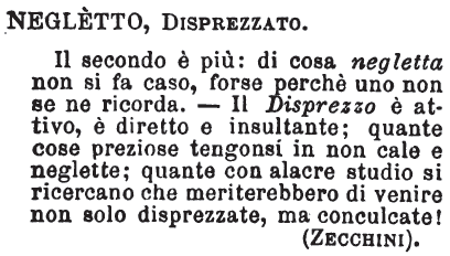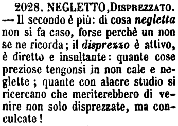 | Negletto, Disprezzato - Il secondo è più: di cosa negletta non si fa caso, forse perché un non se ne ricorda; il disprezzo è attivo, è diretto e insultante: quante cose preziose tengonsi in non cale e neglette; quante con alacre studio si ricercano che meriterebbero di venire non solo disprezzate, ma conculcate! [immagine] |