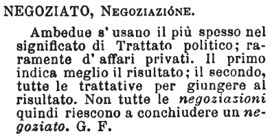 | Negoziato, Negoziazione - Ambedue s'usano il più spesso nel significato di Trattato politico; raramente d'affari privati. Il primo indica meglio il risultato; il secondo, tutte le trattative per giungere al risultato. Non tutte le negoziazioni quindi riescono a conchiudere un negoziato. G. F. [immagine] |