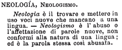 | Neologia, Neologismo - Neologia è il trovare e mettere in uso voci nuove che mancano a una lingua. - Neologismo è l'abuso o l'affettazione di parole nuove, non conformi alla natura di una lingua; ed è la parola stessa così abusata. [immagine] |