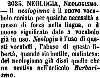 | Neologia, Neologismo - Il neologismo è il nuovo vocabolo coniato per qualche necessità e messo di forza nella lingua, o il nuovo significato dato a vocabolo già in uso. Neologia è l'uso di questi vocaboli, l'abuso di questa libertà, quando sia inutile, malintesa: del neologismo già dissi quello che ne sentiva nell'articolo Barbarismo. [immagine] |