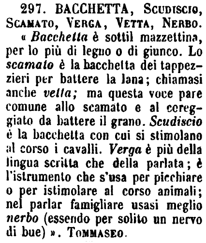 | Bacchetta, Scudiscio, Scamato, Verga, Vetta, Nerbo - « Bacchetta è sottil mazzettina, per lo più di legno o di giunco. Lo scamato è la bacchetta dei tappezzieri per battere la lana; chiamasi anche vetta; ma questa voce pare comune allo scamato e al coreggiato da battere il grano. Scudiscio è la bacchetta con cui si stimolano al corso i cavalli. Verga è più della lingua scritta che della parlata; è l'istrumento che s'usa per picchiare o per istimolare al corso animali; nel parlar famigliare usasi meglio nerbo (essendo per solito un nervo di bue)». Tommaseo. [immagine] |