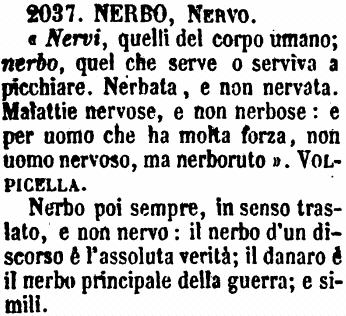 | Nerbo, Nervo - «Nervi, quelli del corpo umano; nerbo, quel che serve o serviva a picchiare. Nerbata, e non nervata. Malattie nervose, e non nerbose: e per uomo che ha molta forza, non uomo nervoso, ma nerboruto». Volpicella.