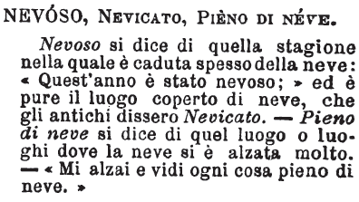 | Nevoso, Nevicato, Pieno di neve - Nevoso si dice di quella stagione nella quale è caduta spesso della neve: «Quest'anno è stato nevoso;» ed è pure il luogo coperto di neve, che gli antichi dissero Nevicato. - Pieno di neve si dice di quel luogo o luoghi dove la neve si è alzata molto. - «Mi alzai e vidi ogni cosa pieno di neve.» [immagine] |