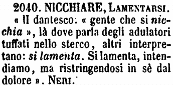 | Nicchiare, Lamentarsi - «Il dantesco: « gente che si nicchia », là dove parla degli adulatori tuffati nello sterco, altri interpretano: si lamenta. Si lamenta, intendiamo, ma ristringendosi in sè dal dolore». Neri. [immagine] |