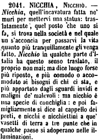 | Nicchia, Nicchio - Nicchia, quell'incavatura fatta ne' muri per mettervi una statua: traslatamente, quel posto che uno si fa, si trova nella società e nel quale un s'acconcia per passarvi la vita quanto più tranquillamente gli venga fatto. Nicchio in qualche parte d'Italia ha questo senso traslato, il proprio non mai; ma dice luogo forse più riposto, e più comodo o accomodato ai bisogni di chi ci sta, e più appartato dagli sguardi invidi e maligni de' malevoli: ma nicchio è una specie di conchiglia: e poi famigliarmente si dice al cappello dei preti, e nicchi e nicchiettini a que' vasetti di terra a tre punte che in qualche paese si adoperano nelle illuminazioni. [immagine] |
