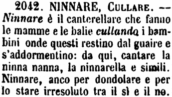 | Ninnare, Cullare - Ninnare è il canterellare che fanno la mamme e le balie cullando i bambini onde questi restino dal guaire e s'addormentino: da qui, cantare la ninna nanna, la ninnarella e simili. Ninnare, anco per dondolare e per lo stare irresoluto tra il sì e il no. [immagine] |