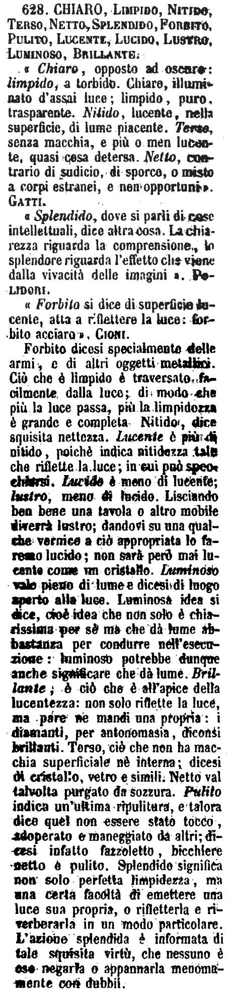 | Chiaro, Limpido, Nitido, Terso, Netto, Splendido, Forbito, Pulito, Lucente, Lucido, Lustro, Luminoso, Brillante - «Chiaro, opposto ad oscuro: limpido, a torbido. Chiaro, illuminato d'assai luce; limpido, puro, trasparente. Nitido, lucente, nella superficie, di lume piacente. Terso, senza macchia, e più o men lucente, quasi cosa detersa. Netto, contrario di sudicio, di sporco, o misto a corpi estranei, e non opportuni». Gatti.
