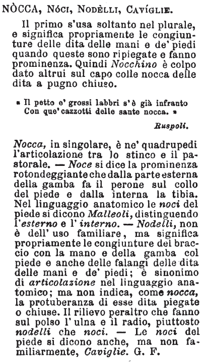 | Nocca, Noci, Nodelli, Caviglie - Il primo s'usa soltanto nel plurale, e significa propriamente le congiunture delle dita delle mani e de' piedi quando queste sono ripiegate e fanno prominenza. Quindi Nocchino è colpo dato altrui sul capo colle nocca delle dita a pugno chiuso.