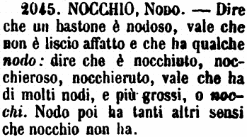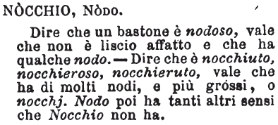| Nocchio, Nodo - Dire che un bastone è nodoso, vale che non è liscio affatto e che ha qualche nodo: dire che è nocchiuto, nocchieroso, nocchieruto, vale che ha di molti nodi, e più grossi, o nocchi. Nodo poi ha tanti altri sensi che nocchio non ha. [immagine] |