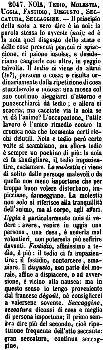 | Fastidio, Noja - Fastidio è tutto ciò che molesta attualmente e materialmente, e che ci studiamo, quanto è in noi, di rimuovere. - Noja è meno materiale, e può procedere, non da cose materiali, ma da condizioni morali, da disposizione di animo o da simili cagioni. Fastidio è cosa positiva, Noja è privazione di letizia. [immagine] |