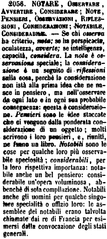 | Notare, Osservare, Avvertire, Considerare; Note, Pensieri, Osservazioni, Riflessioni, Considerazioni; Notabile, Considerabile - Se chi osserva ha criterio, nota; se ha perspicacia, oculatezza, avverte; se intelligenza, capacità, considera. La nota è osservazione speciale; la considerazione è un seguito di riflessioni sulla cosa, perché la considerazione non istà alla prima idea che ne nasce in pensiero, ma nell'osservare da ogni lato e in ogni sua probabile conseguenza: questa è considerazione. Pensieri sono le idee staccate che ci vengono dalla ponderata considerazione di un oggetto; molti scrivono i loro pensieri, e, riuniti, ne fanno un libro. Notabili sono le cose per qualche loro più osservabile speciosità; considerabili, per la loro rispettiva importanza: notabile anche un bel pensiero: considerabile un'opera voluminosa, abbenché di sola compilazione. Notabili anche gli uomini per qualche singolare specialità o uffizio loro: le assemblee dei notabili erano talvolta chiamate dai re di Francia per esimersi dalla convocazione degli stati generali. [immagine] |