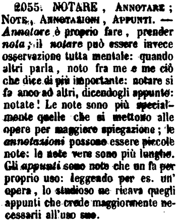 | Notare, Annotare, Note, Annotazioni, Appunti - Annotare è proprio fare, prender nota, il notare può essere invece osservazione tutta mentale: quando altri parla, noto fra me e me ciò che dice di più importante: notare si fa anco ad altri, dicendogli appunto: notate! Le note sono più specialmente quelle che si mettono alle opere per maggiore spiegazione; le annotazioni possono essere piccole note: le note vere sono più lunghe. Gli appunti sono note che un fa per proprio uso: leggendo per es. un'opera, lo studioso ne ricava quegli appunti che crede maggiormente necessarii all'uso suo. [immagine] |