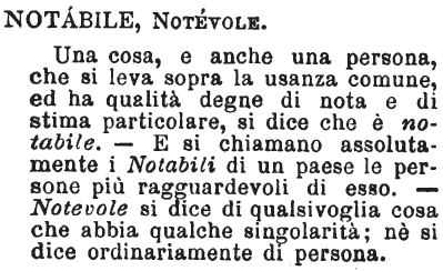 | Notabile, Notevole - Una cosa, e anche una persona, che si leva sopra la usanza comune, ed ha qualità degne di nota e di stima particolare, si dice che è notabile. - E si chiamano assolutamente i Notabili di un paese le persone più ragguardevoli di esso. - Notevole si dice di qualsivoglia cosa che abbia qualche singolarità; nè si dice ordinariamente di persona. [immagine] |