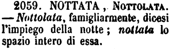 | Nottata, Nottolata - Nottolata, famigliarmente, dicesi l'impiego della notte; nottata lo spazio intero di essa. [immagine] |
