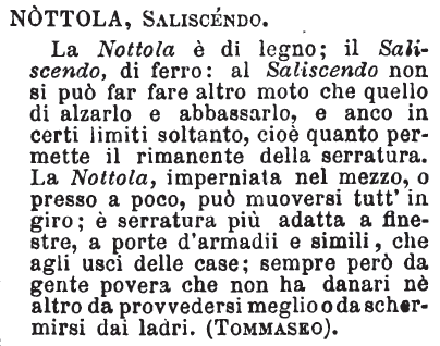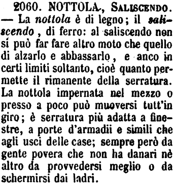 | Nottola, Saliscendo - La Nottola è di legno; il Saliscendo, di ferro: al Saliscendo non si può far fare altro moto che quello di alzarlo e abbassarlo, e anco in certi limiti soltanto, cioè quanto permette il rimanente della serratura. La Nottola, imperniata nel mezzo, o presso a poco, può muoversi tutt'in giro; è serratura più adatta a finestre, a porte d'armadii e simili, che agli usci delle case; sempre però da gente povera che non ha danari nè altro da provvedersi meglio o da schermirsi dai ladri. (Tommaseo). [immagine] |