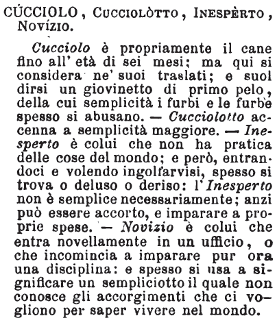 | Cucciolo, Cucciolotto, Inesperto, Novizio - Cucciolo è propriamente il cane fino all'età di sei mesi; ma qui si considera ne' suoi traslati; e suol dirsi un giovinetto di primo pelo, della cui semplicità i furbi e le furbe spesso si abusano. - Cucciolotto accenna a semplicità maggiore. - Inesperto è colui che non ha pratica delle cose del mondo; e però, entrandoci e volendo ingolfarvisi, spesso si trova o deluso o deriso: l'Inesperto non è semplice necessariamente; anzi può essere accorto, e imparare a proprie spese. - Novizio è colui che entra novellamente in un ufficio, o che incomincia a imparare pur ora una disciplina: e spesso si usa a significare un sempliciotto il quale non conosce gli accorgimenti che ci vogliono per saper vivere nel mondo. [immagine] |