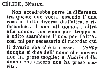 | Celibe, Nubile - Non accadrebbe porre la differenza tra queste due voci, essendo l'una cosa al tutto diversa dall'altra, e riferendosi, l'una all'uomo, l'altra alla donna; ma come pur troppo si è udito scambiare l'una per l'altra, così mi par necessario di ricordar qui il divario che c'è tra esse. - Celibe dunque si dice dell'uomo che ancora non ha preso moglie; e Nubile della donna che ancora non ha preso marito. [immagine] |