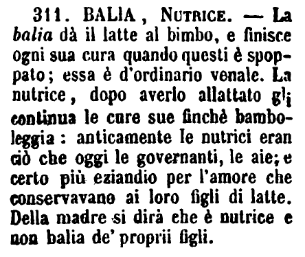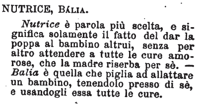 | Nutrice, Balia - Nutrice è parola più scelta, e significa solamente il fatto del dar la poppa al bambino altrui, senza per altro attendere a tutte le cure amorose, che la madre riserba per sè. - Balia è quella che piglia ad allattare un bambino, tenendolo presso di sè, e usandogli essa tutte le cure. [immagine] |