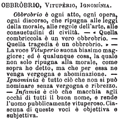 | Obbrobrio, Vituperio, Ignominia - Obbrobrio è ogni atto, ogni opera, ogni discorso, che ripugna alle leggi della morale, alle regole dell'arte, alle consuetudini di civiltà. - «Quella combriccola è un vero obbrobrio. - Quella tragedia è un obbrobrio.» - La voce Vituperio suona biasimo maggiore; ed è qualunque cosa, la quale non solo ripugna alla morale, come sopra ho detto, ma che per essa ne venga vergogna e abominazione. - Ignominia è tutto ciò che non si può nominare senza vergogna e ribrezzo. - Infamia è ciò che macchia agli occhi di tutti il buon nome, e rende l'uomo pubblicamente vituperoso. Ciascuna di queste voci è objettiva e subjettiva. [immagine] |