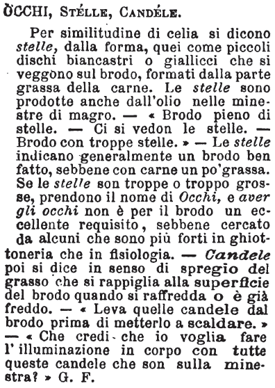 | Occhi, Stelle, Candele - Per similitudine di celia si dicono stelle, dalla forma, quei come piccoli dischi biancastri o giallicci che si veggono sul brodo, formati dalla parte grassa della carne. Le stelle sono prodotte anche dall'olio nelle minestre di magro. - «Brodo pieno di stelle. - Ci si vedon le stelle. - Brodo con troppe stelle.» - Le stelle indicano generalmente un brodo ben fatto, sebbene con carne un po' grassa. Se le stelle son troppe o troppo grosse, prendono il nome di Occhi, e aver gli occhi non è per il brodo un eccellente requisito, sebbene cercato da alcuni che sono più forti in ghiottoneria che in fisiologia. - Candele poi si dice in senso di spregio del grasso che si rappiglia alla superficie del brodo quando si raffredda o è già freddo. - «Leva quelle candele dal brodo prima di metterlo a scaldare.» - «Che credi che io voglia fare l'illuminazione in corpo con tutte queste candele che son sulla minestra?» G. F. [immagine] |