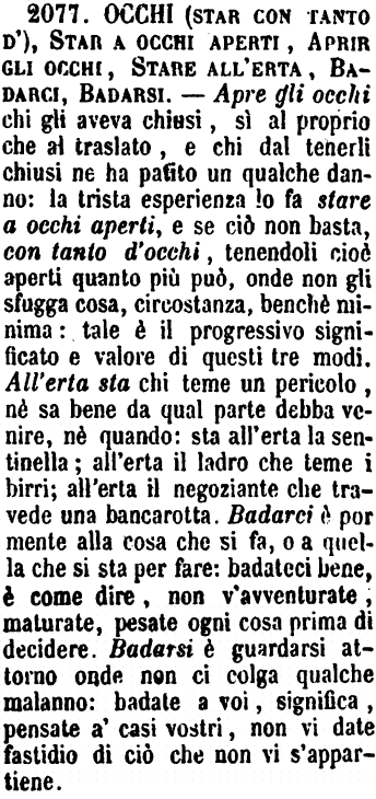 | Occhi (Star con tanto d'), Star a occhi aperti, Aprir gli occhi, Stare all'erta, Badarci, Badarsi - Apre gli occhi chi gli aveva chiusi, sì al proprio che al traslato, e chi dal tenerli chiusi ne ha patito un qualche danno: la trista esperienza lo fa stare a occhi aperti, e se ciò non basta, con tanto d'occhi, tenendoli cioè aperti quanto più può, onde non gli sfugga cosa, circostanza, benchè minima: tale è il progressivo significato e valore di questi tre modi. All'erta sta chi teme un pericolo, nè sa bene da qual parte debba venire, nè quando: sta all'erta la sentinella; all'erta il ladro che i teme i birri; all'erta il negoziante che travede una bancarotta. Badarci è por mente alla cosa che si fa, o a quella che si sta per fare: badateci bene, è come dire, non v'avventurate, maturate, pesate ogni cosa prima di decidere. Badarsi è guardarsi attorno onde non ci colga qualche malanno: badate a voi, significa, pensate a' casi vostri, non vi date fastidio di ciò che non vi s'appartiene. [immagine] |