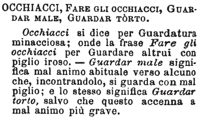 | Occhiacci, Fare gli occhiacci, Guardar male, Guardar torto - Occhiacci si dice per Guardatura minacciosa; onde la frase Fare gli occhiacci per Guardare altrui con piglio iroso. - Guardar male significa mal animo abituale verso alcuno che, incontrandolo, si guarda con mal piglio; e lo stesso significa Guardar torto, salvo che questo accenna a mal animo più grave. [immagine] |