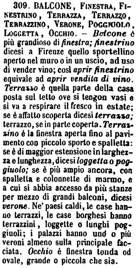 | Balcone, Finestra, Finestrino, Terrazza, Terrazzo, Terrazzino, Verone, Poggiuolo, Loggetta, Occhio - Balcone è più grandioso di finestra; finestrino dicesi a Firenze quello sportellino aperto nel muro o in un uscio, ad uso di vender vino; così aprir finestrino equivale ad aprir vendita di vino. Terrazzo è quella parte della casa posta sul tetto ove si tengon vasi e si va a respirare il fresco in estate; se è affatto scoperta dicesi terrazza; terrazzo, se in parte coperta. Terrazzino è la finestra aperta fino al pavimento con piccolo sporto e spalletta: se è di maggior estensione in larghezza e lunghezza, dicesi loggetta o poggiuolo; se è più ampio ancora, con spalletta e colonnette di marmo, e a cui si abbia accesso da più stanze per mezzo di grandi balconi, dicesi verone. Ne' paesi caldi, le case hanno terrazzi, le case borghesi hanno terrazzini, loggette o lunghi poggiuoli; i palazzi hanno uno o più veroni almeno sulla principale facciata. Occhio è finestra tonda od ovale, grande o piccola che sia. [immagine] |