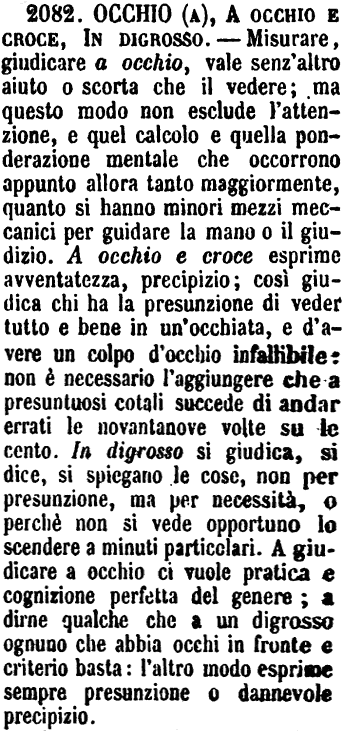 | Occhio, A chius’occhi, A occhi chiusi - A chius'occhi ha significato morale più che materiale, e significa Senza attenzione, Senza troppo pensarci, come per es.: « Si arrischiò in quell'impresa a chius'occhi. » - Quando si dice A occhi chiusi si accenna lo stato della persona che sta a occhi chiusi, nè piglia senso figurato. - « Cammina a occhi chiusi; e va sempre diritto senza inciampare. » - [A occhi chiusi può usarsi anche nel figurato; A chius'occhi non cade mai nel proprio. G. F.] [immagine] |